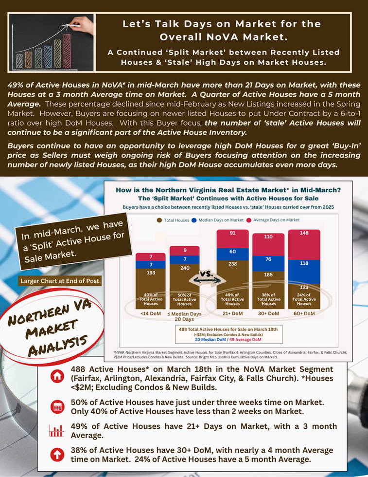 💠49% of Active Houses in the NoVA Market segment have 21+ Days, with a 3 month Average. 24% of Active Houses the the NoVA Market segment have 60+ Days, with a 5 month Average time on Market.