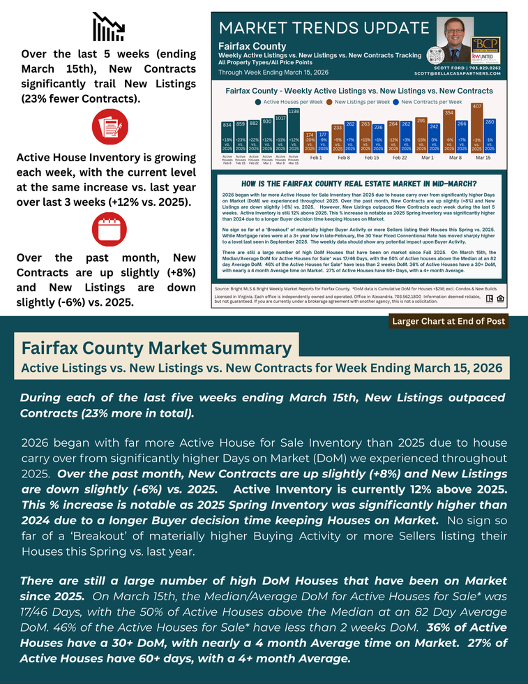 ➡️ Higher House for Sale Inventory than 2025, which is notable as 2025 Inventory was significantly higher than 2024. Active House for Sale Inventory in Fairfax County is +12% vs. 2025. Inventory in February, March, and April 2025 was already at a high level with 24%, 55%, and 62% increases vs. the prior year. New Listings outpaced New Contracts each of the last 5 weeks (Ending March 15th), even though New Listings are down (-7%) vs. 2025 from late February to mid-March.