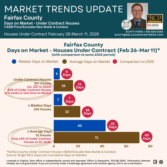 ➡️ Buyers are focusing on newly listed Houses, rather than high DoM Houses, by a 6-to-1 margin. 83% of Under Contract Houses in Fairfax County during the 2 weeks ending March 11th had less than 2 weeks on Market. Contrast this number with only 13% of Under Contract Houses have 21+ Days on Market, with a 3 month Average.