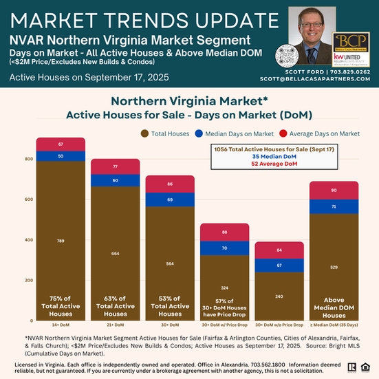 ➡️ The DoM numbers show that the Buyers continue to have a lengthy house decision process. The Active for Sale Houses on September 17 in Fairfax County have a Median & Average DoM of 34 & 50 days. The 50% of Houses for Sale above the Median DoM have an average 84 days on market. The overall Northern Virginia market segment has similar DoM numbers (35/52/90 days). The increase in DoM has stabilized at a high level since early July. We saw a slight decrease in DoM numbers over the past two weeks, but this decline is due to the influx of New Listings in Fairfax County, rather than Buyers putting more high DoM houses under contract.